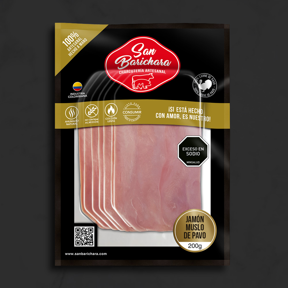 INGREDIENTES: Muslo de pavo, Agua, Sal, Tripolifosfato de Sodio (Regulador de acidez), Mezcla de acetato de sodio y lactato de sodio (Conservante), Mezcla Estabilizante (Sal, Carbonatos de Sodio, Dióxido de Silicio), Glutamato monosodico (Acentuador de sabor), Cebolla en polvo (Especia), Ajo en polvo (Especia), Eritorbato de Sodio (Antioxidante), Sal Praga (Sal, Nitrito de sodio) (Conservante), Bicarbonato de Sodio (Regulador de acidez), Dioxido de Silicio (Anticompactante), Colorante artificial Eritrosina C.I. 45430. • Conservación: Manténgase refrigerado de 0º a 4º C. Una vez abierto, consúmase en el menor tiempo posible. • RSA-0007642-2019